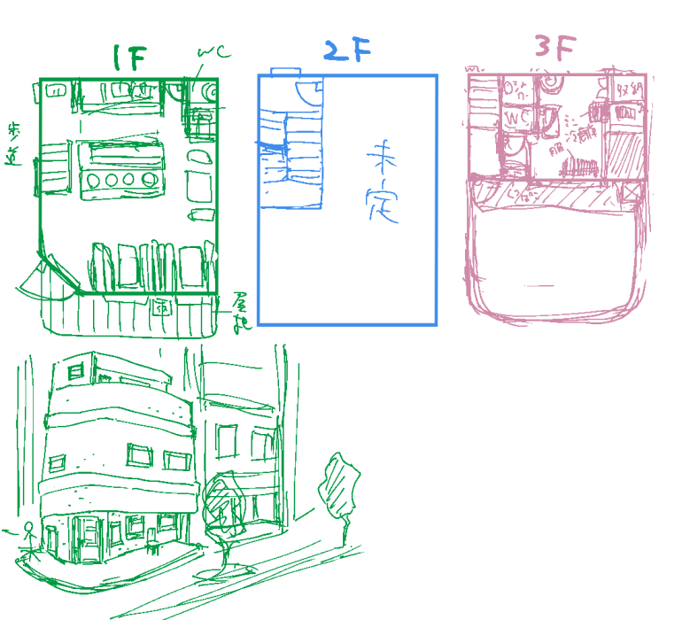 その途中、あまりに適当にしていた喫茶店兼バーの内装や外装を改めたいなと思ったり、あと天之の住んでいる部屋をもっと綺麗に整えてあげたいなという気持ちが高まって再デザインしています。ついでに立地も変えたくなったのでいつの間にか移転してもらうことにしました。渋谷松濤→銀座、新橋あたりに引越してそうです。今後も変わるかも。もう既に色々描いてしまったあとにこんなことしてますが趣味で描いてるもんなんでOKです。暇と必要があれば以前のページも描き直すかもしれないです。未来の自分が何とかしてくれる。