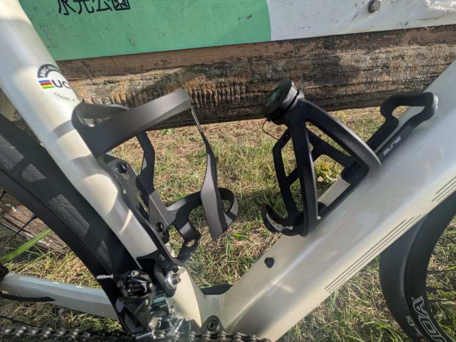 ③ボトルケージ(バイクじゃない)。スペシャライズドの右抜きとELITEのダイヤル式カーボン製ボトルケージ(ダイヤル式超便利)